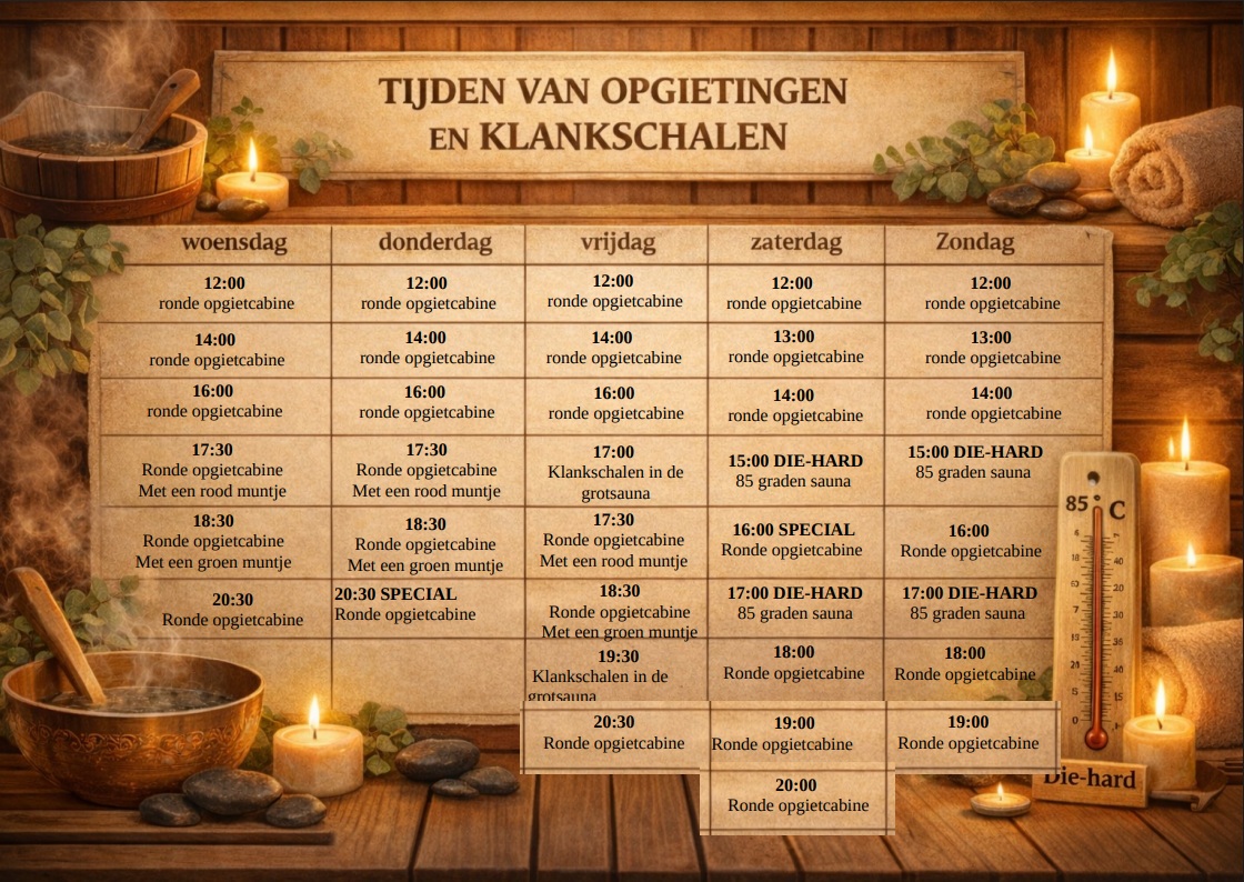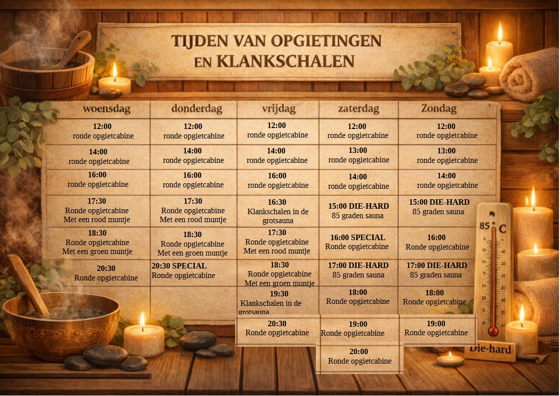 Dagelijks verzorgen onze saunameesters opgietingen met heerlijke geuren, muziek en het rondzwaaien – en wapperen van de hete lucht.